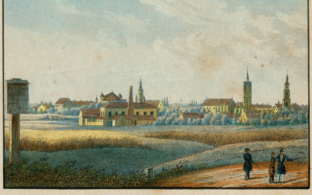 Gasanstalt (links der Bildmitte) mit Schornstein der ICGA in der Glocksee, gesehen etwa von der (späteren) Limmerstraße Ecke Blumenauerstraße; kolorierter Stahlstich nach einer Lithografie von Friedrich August Schmidt, um 1830